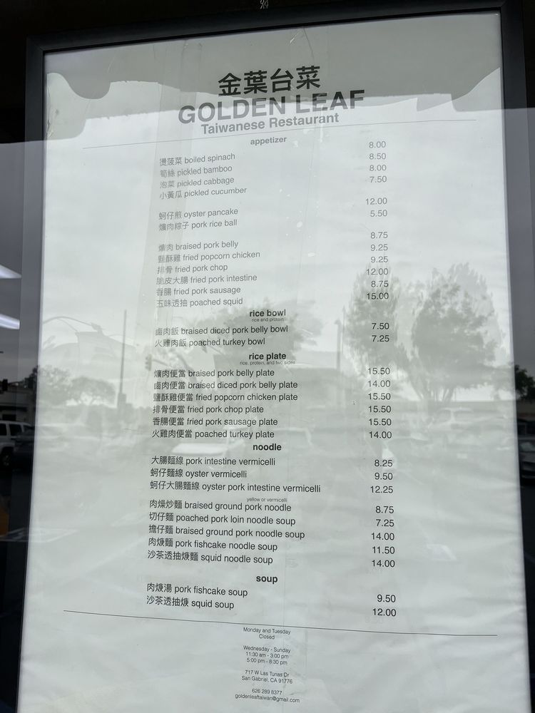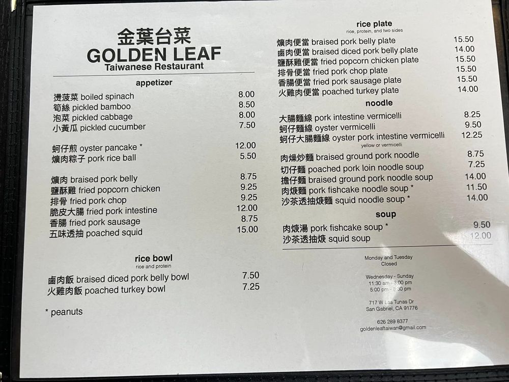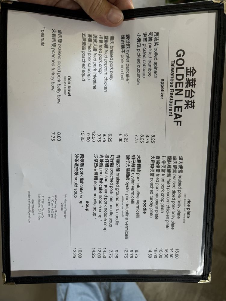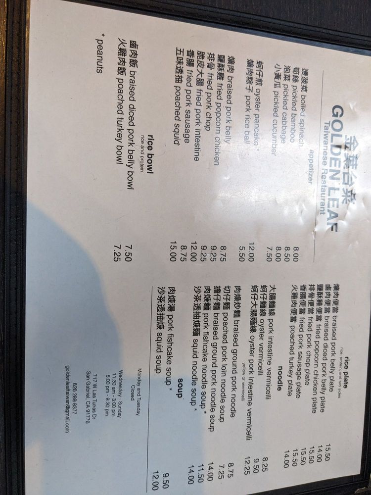Golden Leaf in San Gabriel offers authentic Taiwanese comfort food in a casual setting. The menu includes popular dishes like oyster noodle soup, crispy pork intestines, and popcorn chicken, all bursting with flavor and perfectly cooked. Customers rave about the squid thick soup noodles, calling it one of the best they've ever had. The restaurant has a small interior with limited seating, so reservations are recommended. Despite some occasional hiccups like a malfunctioning AC, the overall dining experience is top-notch. With the recent addition of indoor dining and updated menu offerings, Golden Leaf continues to be a go-to spot for delicious Taiwanese cuisine. Whether you're a fan of traditional favorites or looking to try something new, this place won't disappoint.